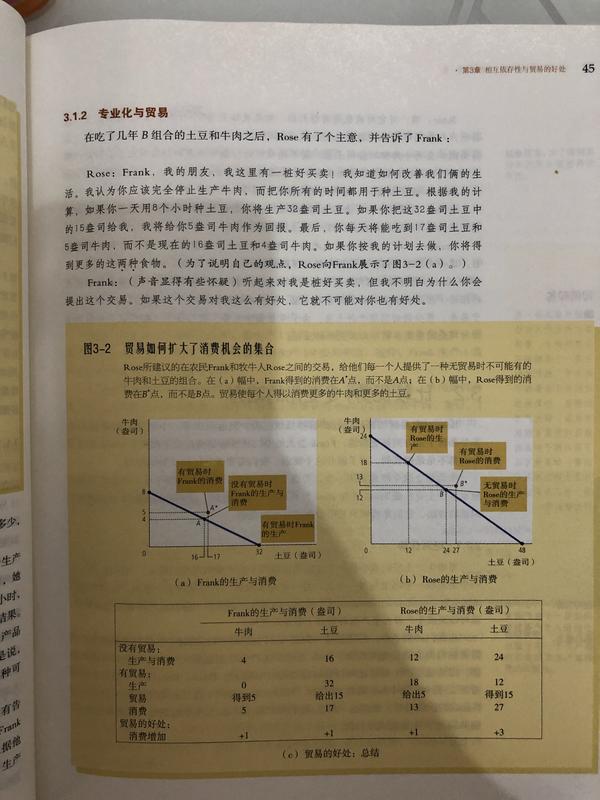 这里结论是贸易优势 是因为比较优势,但是这里的前提假设先不说理想化,先说 生产效率=消耗效率 这点是上面假设的关键,只能说贸易能扩大两者的生产边界,但当一方本就生产效率大于消耗效率,扩大边界对其毫无意义
