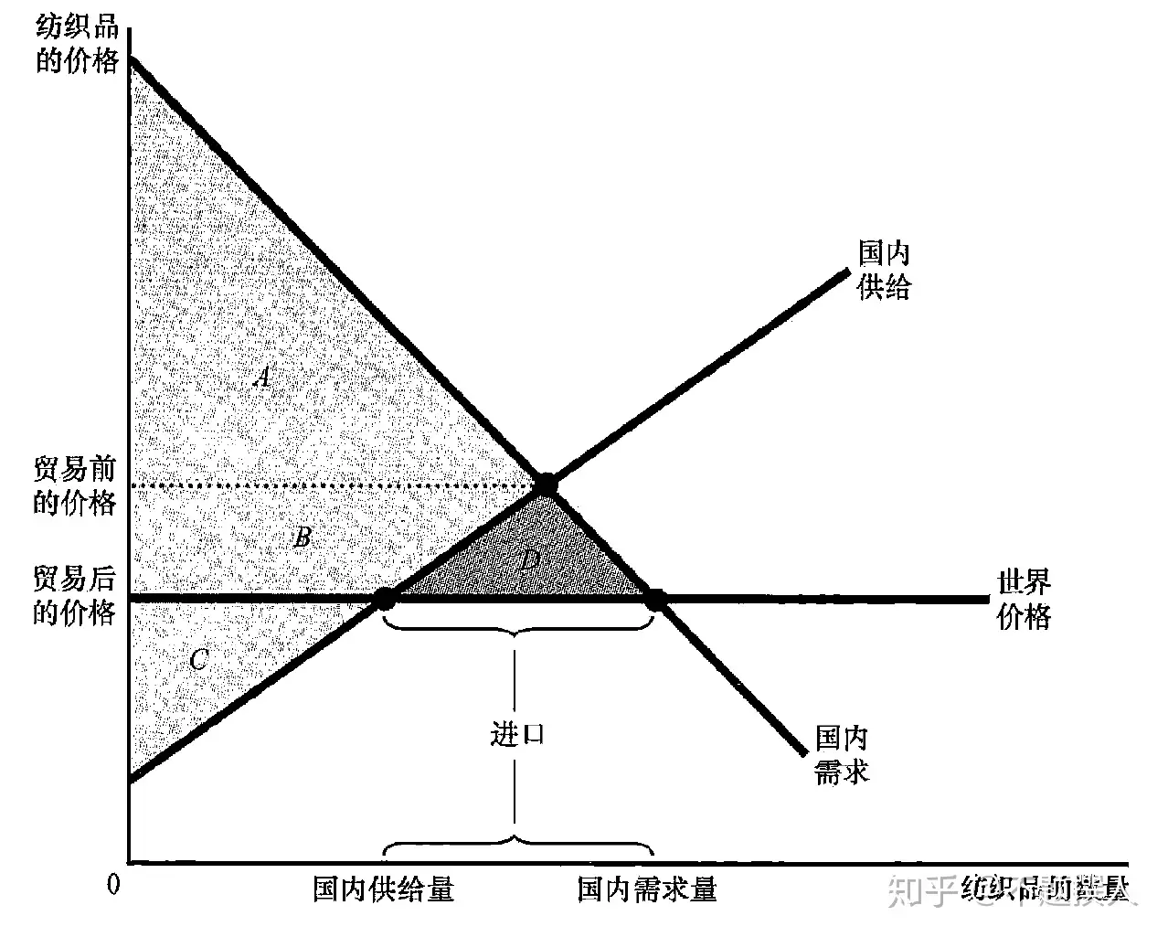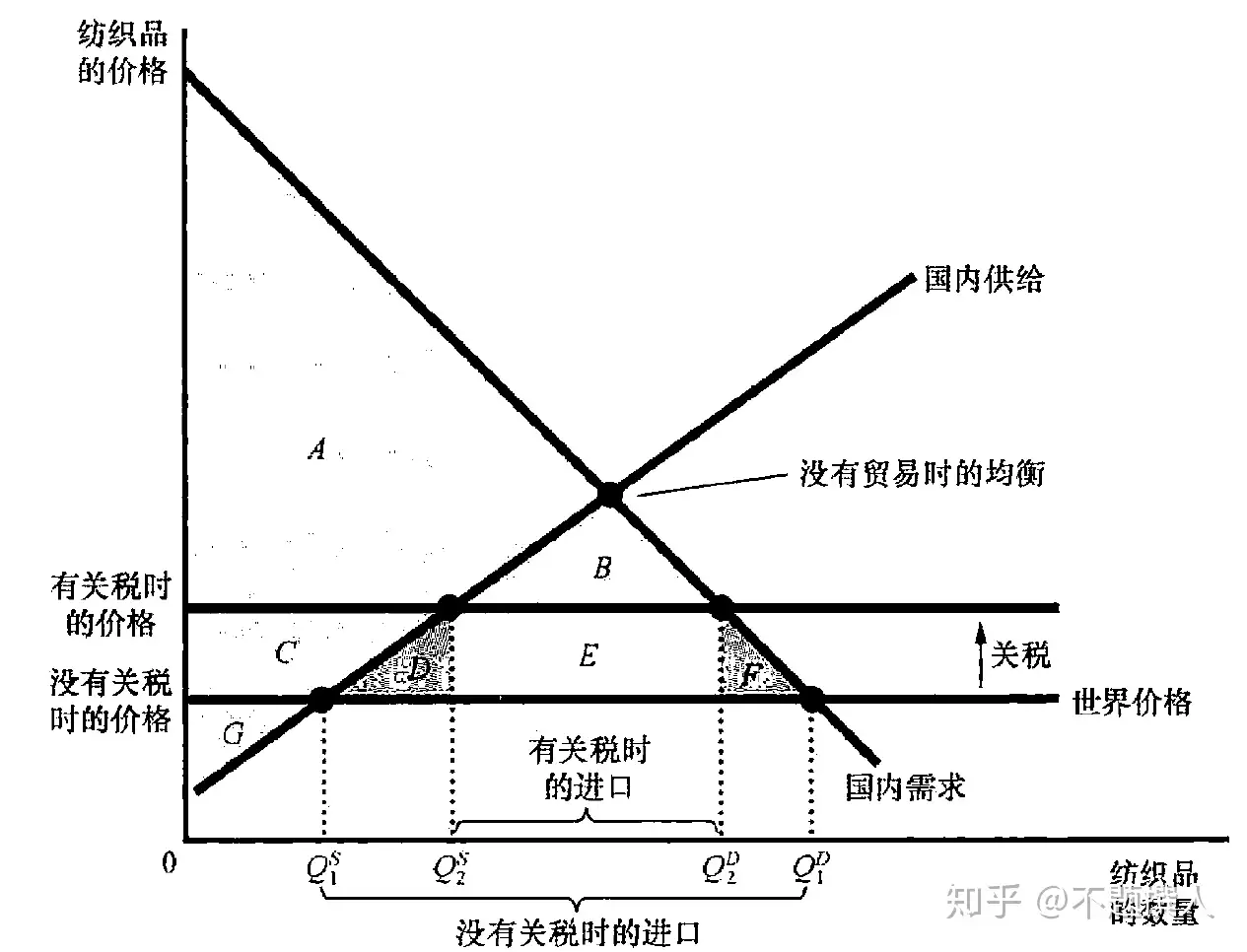 实际政策中 还有进口配额的政策/进口许可证收费,类似于关税,对于进口过来说 都是提高价格,(相对于直接国际贸易)减少了国内消费福利, 增加生产者的福利