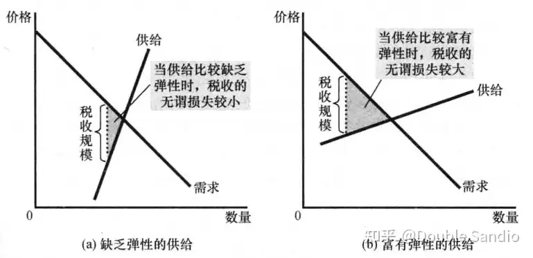 根据之前的数学计算 弹性 在这里极端的想 就是 横坐标相对于纵坐标 的比例,所以 不论需求 供给, 在更有弹性时 同样的 纵向差 对应的横相差会更大,也就是导致 数量变化越明显(无谓损失越大,理想是趋于三角形,三角形 = 1/2 底 * 高,现在 底都是税收规模,而高大约是 底乘上 弹性,所以差不多是 1/2 税收平方 乘弹性的样子)